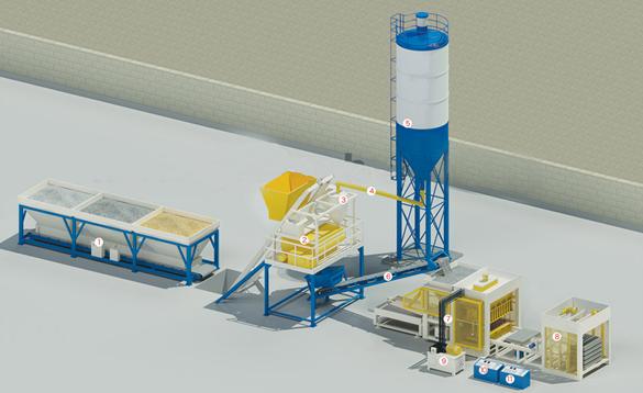 以上制砖生产线各设备分别为:1、电子配料机 2、混凝土搅拌机3、水泥称 4、螺旋水泥泵 5、水泥罐 6、皮带输送机 7、制砖主机 8、叠板机 9、液压泵站 10、PLC控制柜。